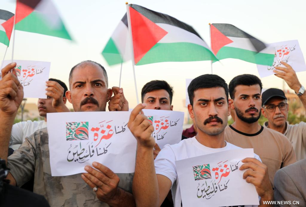 بغداد 23 سبتمبر 2025 (شينخوا) في الصورة الملتقطة يوم 23 سبتمبر 2025، عراقيون يشاركون في مسيرة لإظهار تضامنهم مع سكان قطاع غزة، في بغداد.