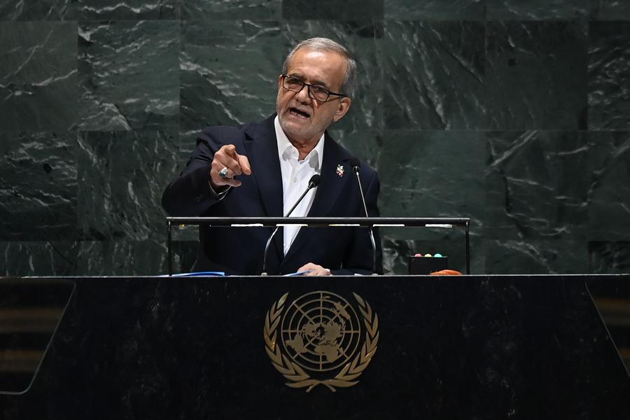 الرئيس الإيراني مسعود بزشكيان يلقى كلمة خلال المناقشة العامة للدورة الـ80 للجمعية العامة للأمم المتحدة في مقر الأمم المتحدة بنيويورك في 24 سبتمبر 2025. (شينخوا)