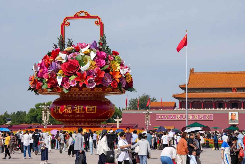 بكين 26 سبتمبر 2025 (شينخوا) في الصورة الملتقطة يوم 25 سبتمبر 2025، سياح يشاهدون مجسما على شكل "سلة زهور" في ميدان تيان آن من بالعاصمة الصينية بكين، حيث تم وضع هذا المجسم، الذي يبلغ ارتفاعه 18 مترا، كديكور لعطلة العيد الوطني القادمة.