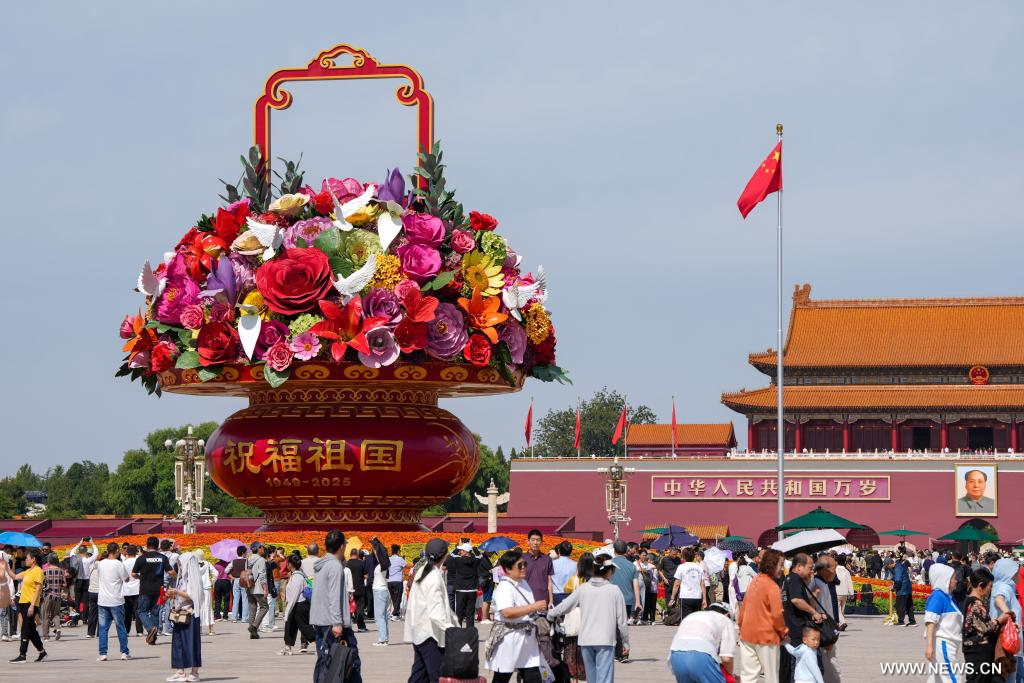 بكين 27 سبتمبر 2025 (شينخوا) في الصورة الملتقطة يوم 25 سبتمبر 2025، مجسم على شكل "سلة زهور" في ميدان تيان آن من بالعاصمة الصينية بكين، حيث تم وضع هذا المجسم، الذي يبلغ ارتفاعه 18 مترا، كديكور لعطلة العيد الوطني القادمة.
