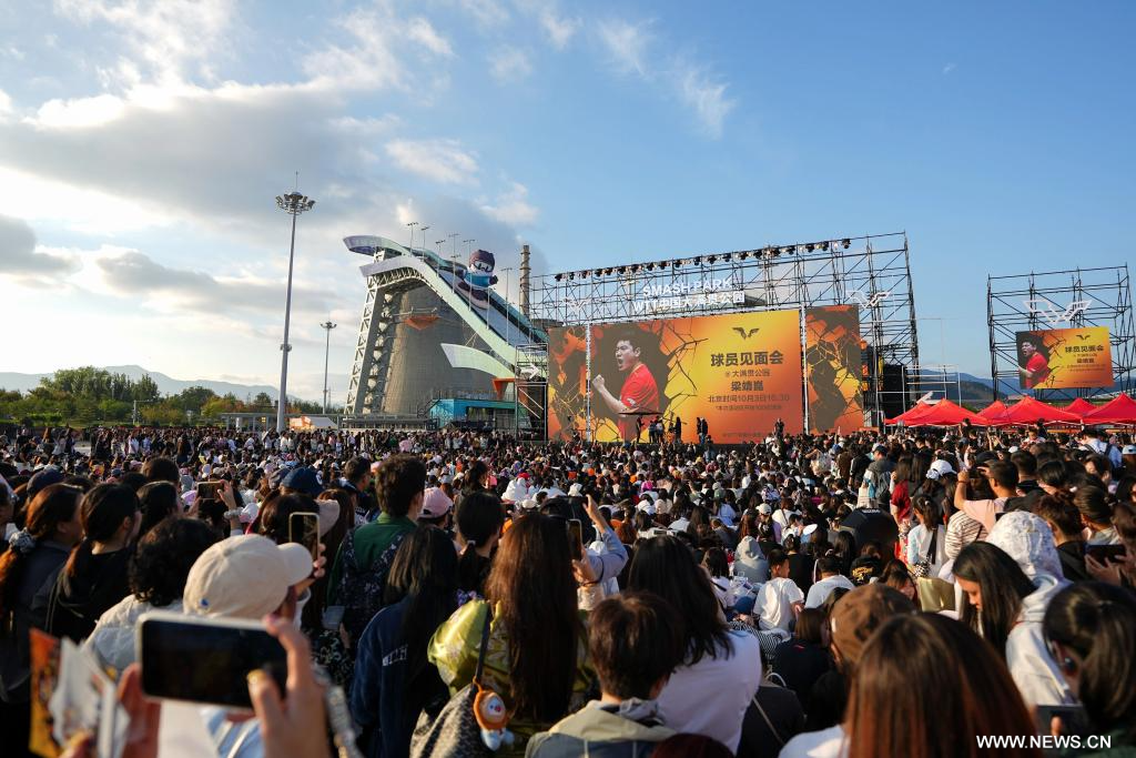 بكين 6 أكتوبر 2025 (شينخوا) في الصورة الملتقطة يوم 3 أكتوبر 2025، مشجعون يشاركون في حدث لقاء وتحية مع لاعبين لمباريات "سماش" في الصين لبطولة العالم لكرة الطاولة 2025 في العاصمة الصينية بكين.