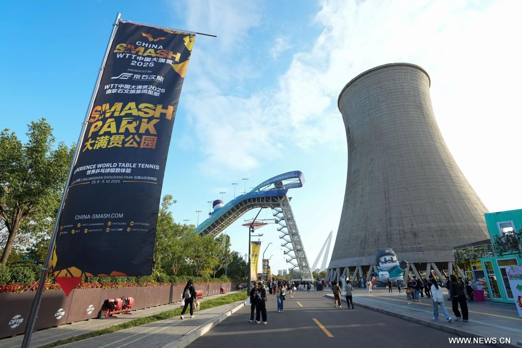 بكين 6 أكتوبر 2025 (شينخوا) في الصورة الملتقطة يوم 3 أكتوبر 2025، زوار في حديقة "سماش" حيث أقيم حدث لمباريات "سماش" في الصين لبطولة العالم لكرة الطاولة 2025 في العاصمة الصينية بكين.