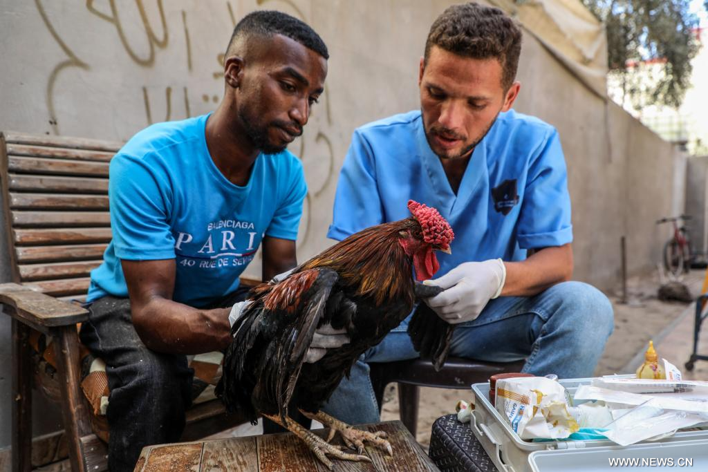 غزة 8 أكتوبر 2025 (شينخوا) في الصورة الملتقطة يوم 7 أكتوبر 2025، متطوعان بيطريان يفحصان ديكا في دير البلح، وسط قطاع غزة.