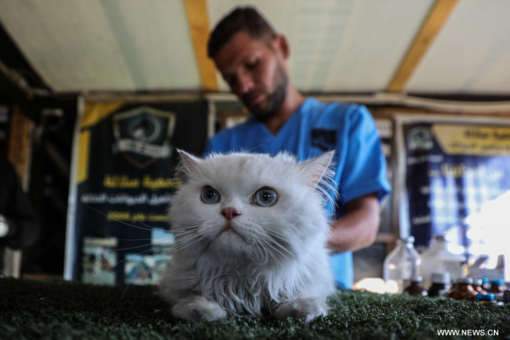 غزة 8 أكتوبر 2025 (شينخوا) في الصورة الملتقطة يوم 7 أكتوبر 2025، متطوع بيطري يفحص قطة في دير البلح، وسط غزة.