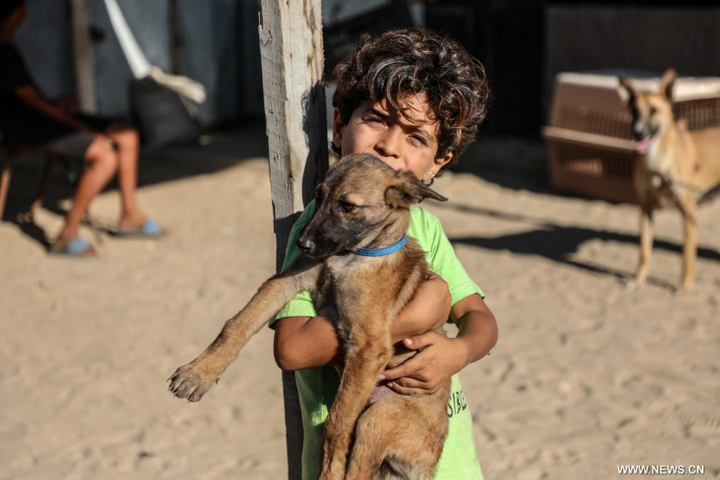 غزة 8 أكتوبر 2025 (شينخوا) في الصورة الملتقطة يوم 7 أكتوبر 2025، طفل يحمل كلبا في دير البلح، وسط غزة.