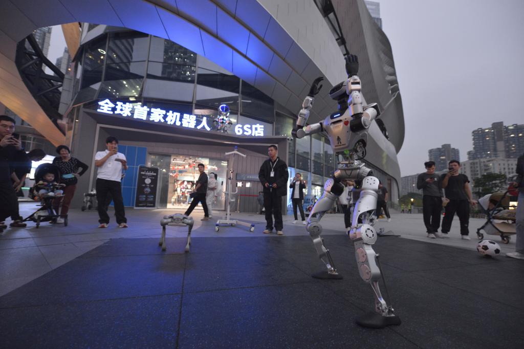 شنتشن 3 نوفمبر 2025 (شينخوا) في الصورة الملتقطة يوم 28 أكتوبر 2025، روبوت شبيه بالبشر يرقص أمام شركة روبوتات في مدينة شنتشن بمقاطعة قوانغدونغ بجنوبي الصين.