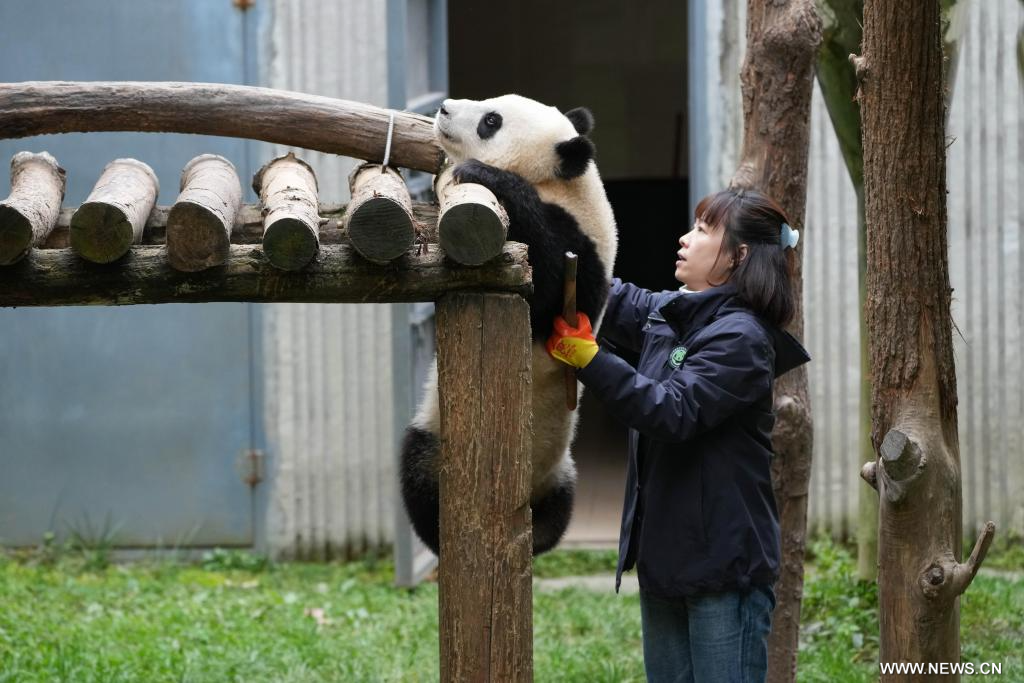 تشنغدو 9 نوفمبر 2025 (شينخوا) في الصورة الملتقطة يوم 6 نوفمبر 2025، مربية تساعد حيوان باندا عملاقة على تعلم التسلق في قاعدة شنشوبينغ للباندا العملاقة بمحمية وولونغ الطبيعية الوطنية في مقاطعة سيتشوان بجنوب غربي الصين.