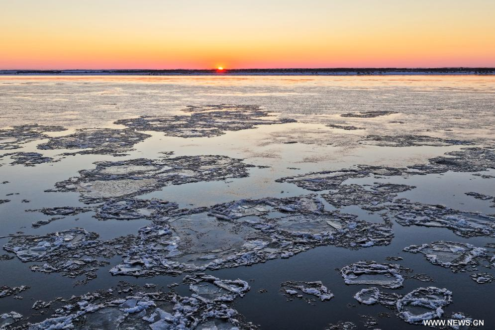 تونغجيانغ 12 نوفمبر 2025 (شينخوا) في الصورة الملتقطة يوم 11 نوفمبر 2025، مناظر تدفق الجليد عند الغروب في قسم تونغجيانغ لنهر سونغهواجيانغ في مقاطعة هيلونغجيانغ بشمال شرقي الصين.