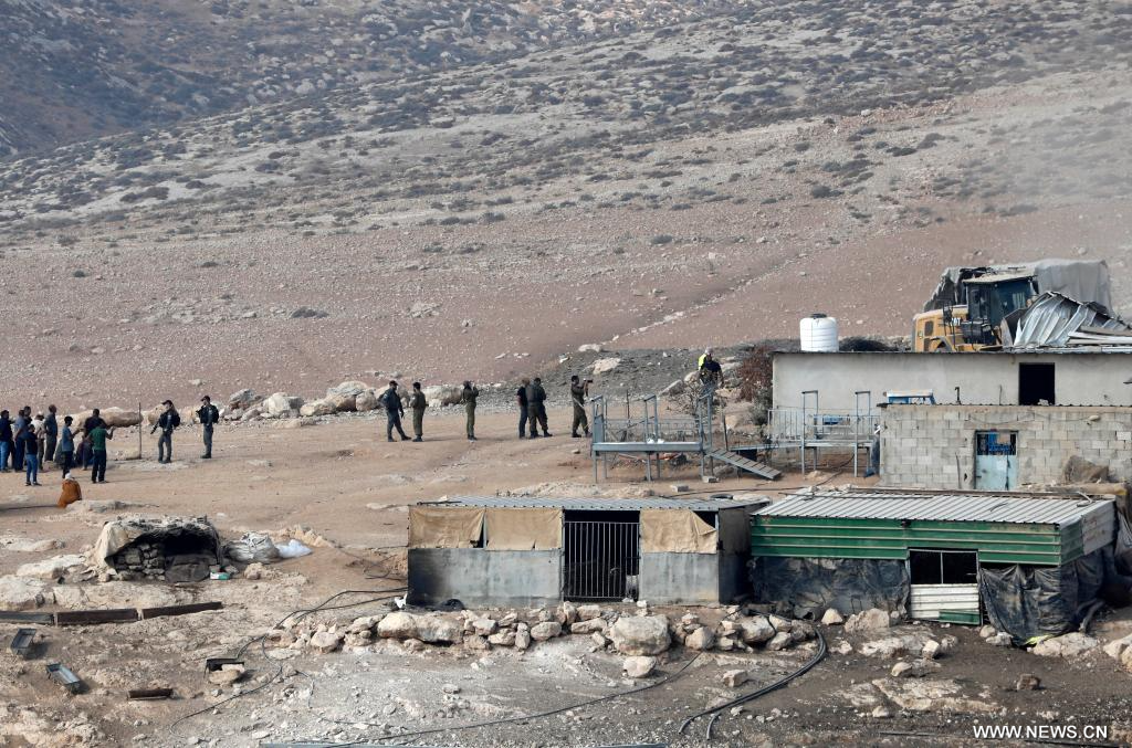 الخليل 13 نوفمبر 2025 (شينخوا) في الصورة الملتقطة يوم 12 نوفمبر 2025، مشهد لوجود أفراد من القوات الإسرائيلية وفلسطينيين أثناء قيام جرافة إسرائيلية بهدم منازل وخيام فلسطينية في منطقة "مسافر يطا" بمدينة الخليل جنوبي الضفة الغربية.■