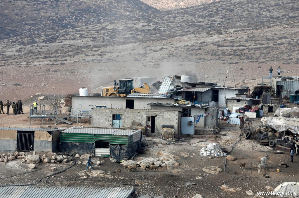 الخليل 13 نوفمبر 2025 (شينخوا) في الصورة الملتقطة يوم 12 نوفمبر 2025، جرافة إسرائيلية تهدم منازل وخياما فلسطينية في منطقة "مسافر يطا" بمدينة الخليل جنوبي الضفة الغربية.■
