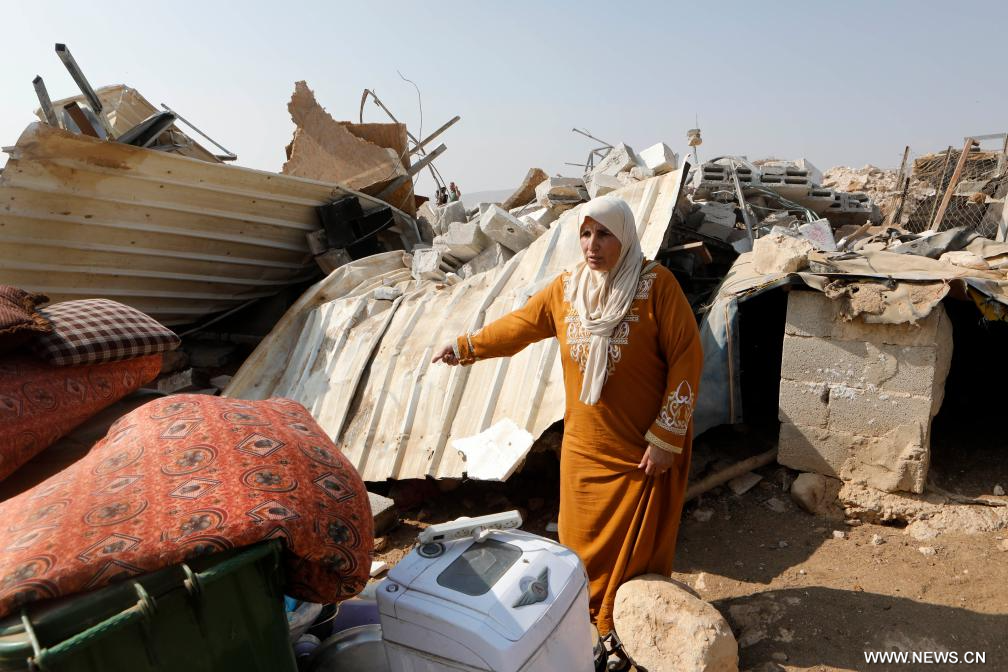 الخليل 13 نوفمبر 2025 (شينخوا) في الصورة الملتقطة يوم 12 نوفمبر 2025، مشهد لسيدة فلسطينية وسط الركام بعد أن هدمت جرافة إسرائيلية منازل وخياما فلسطينية في منطقة "مسافر يطا" بمدينة الخليل جنوبي الضفة الغربية.■