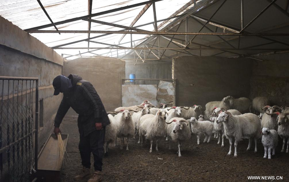 قانغتشا 16 نوفمبر 2025 (شينخوا) في الصورة الملتقطة يوم 13 نوفمبر 2025، راعي ينظف أحواض العلف بحظيرة غنم في ولاية هايبي التبتية ذاتية الحكم في مقاطعة تشينغهاي بشمال غربي الصين.
