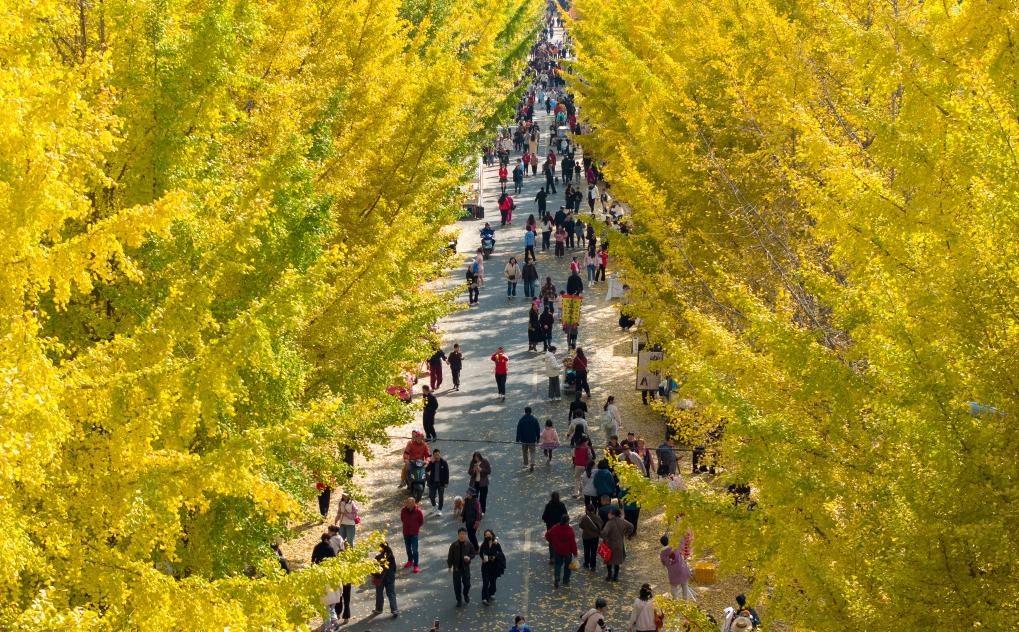 بكين 17 نوفمبر 2025 (شينخوا) في الصورة الملتقطة يوم 15 نوفمبر 2025، سياح يستمتعون بمشاهدة أشجار الجنكة على طول طريق في مدينة بنغتشو بمقاطعة سيتشوان في جنوب غربي الصين.