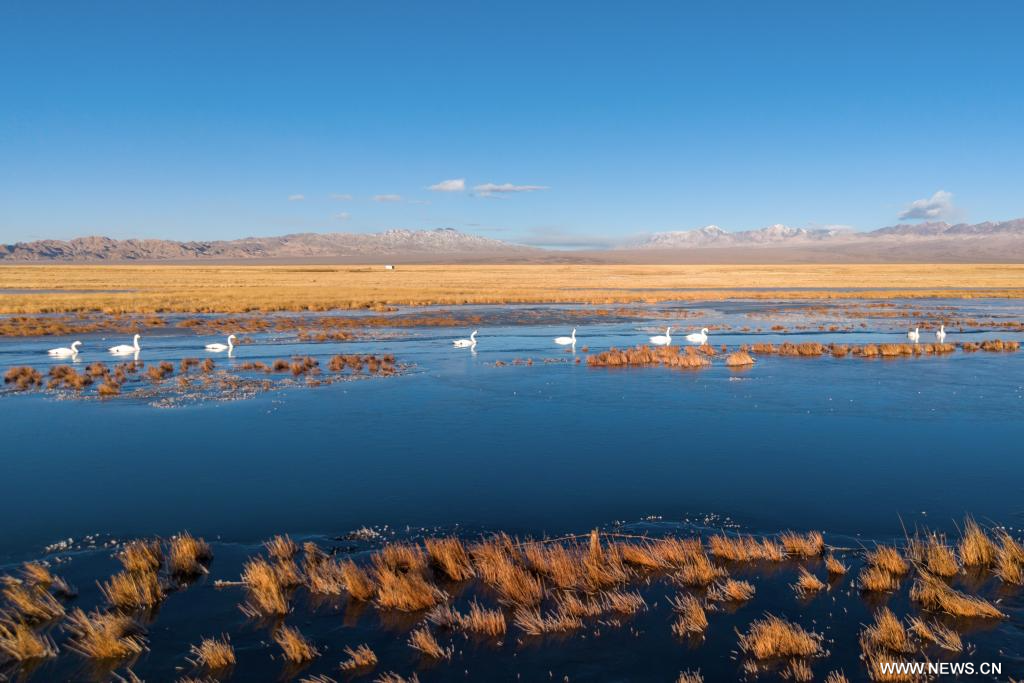 أكساي 17 نوفمبر 2025 (شينخوا) في الصورة الملتقطة يوم 14 نوفمبر 2025، مناظر جميلة لبحيرة شياوسوقان في محافظة أكساي ذاتية الحكم لقومية القازاق بمقاطعة قانسو في شمال غربي الصين.