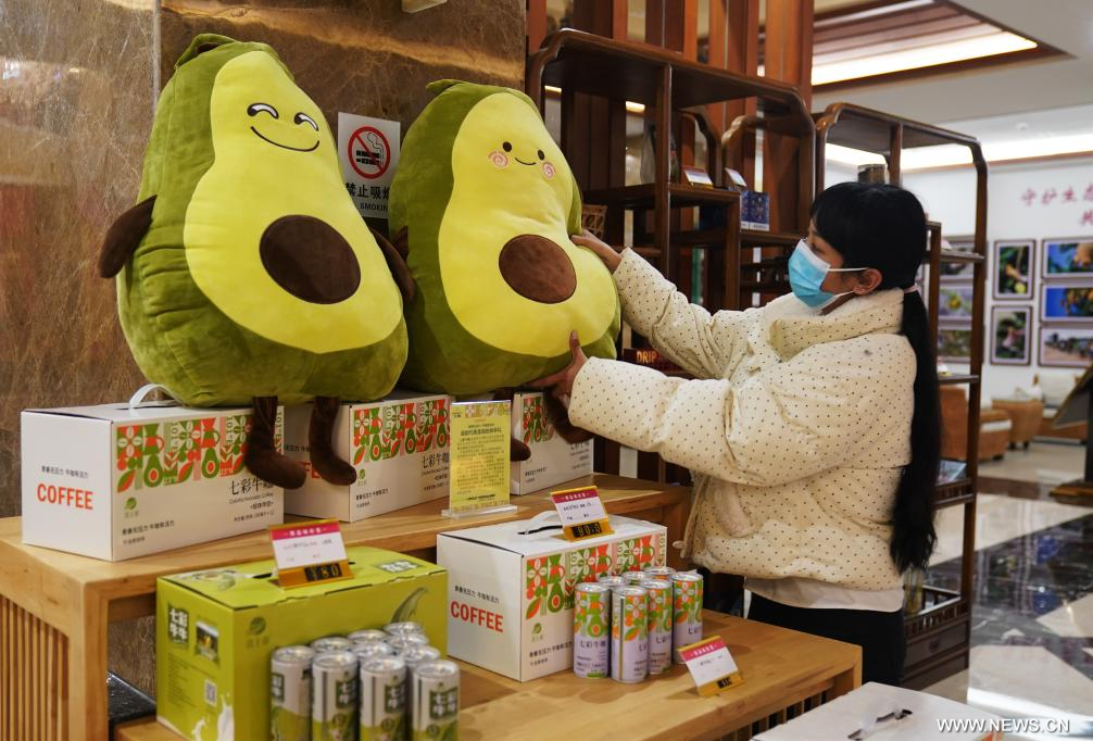 بوأر 19 نوفمبر 2025 (شينخوا) في الصورة الملتقطة يوم 16 نوفمبر 2025، دمى ومنتجات متعلقة بالأفوكادو في متجر بمحافظة منغليان في مدينة بوأر بمقاطعة يوننان في جنوب غربي الصين. ومنذ إدخال الأفوكادو وبدء زراعته في المحافظة في عام 2007، أصبحت محافظة منغليان حاليا واحدة من أكبر قواعد زراعة الأفوكادو في الصين، حيث تبلغ مساحة زراعة الأفوكادو فيها أكثر من 120 ألف مو (حوالي 8000 هكتار).