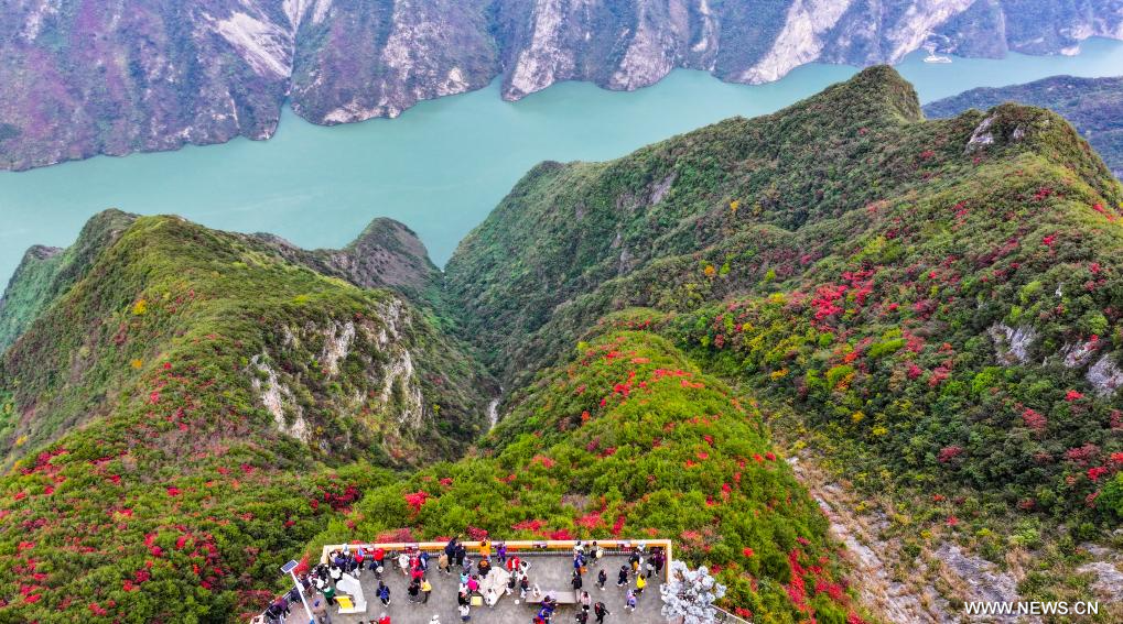 تشونغتشينغ 23 نوفمبر 2025 (شينخوا) في الصورة الملتقطة يوم 22 نوفمبر 2025، مكان ذو مناظر خلابة حيث تبدأ نباتات الجبال بالتحول إلى اللون الأحمر على طول مضيق ووشيا، أحد المضائق الثلاثة على نهر اليانغتسي، بمحافظة ووشان في بلدية تشونغتشينغ بجنوب غربي الصين.