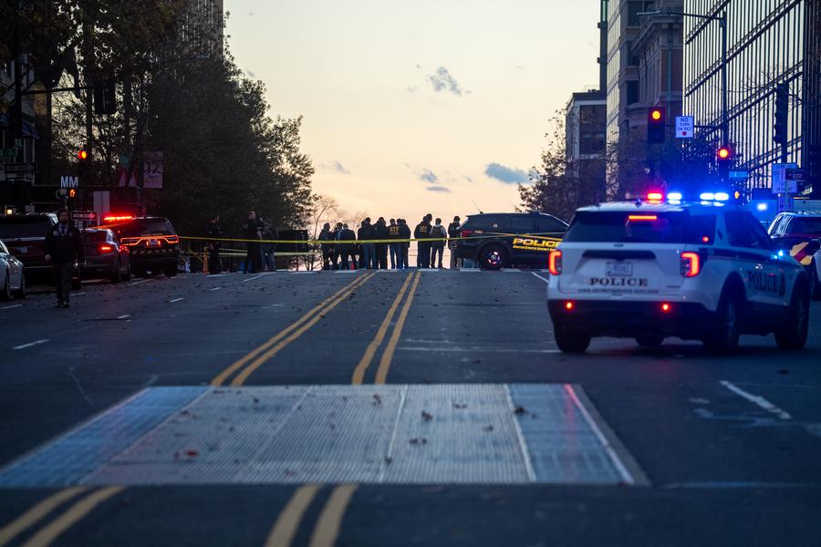 مسؤولون من إنفاذ القانون يزورون مسرح الجريمة بعد إطلاق النار على اثنين من أفراد الحرس الوطني بالقرب من البيت الأبيض في واشنطن العاصمة، الولايات المتحدة، في 26 نوفمبر 2025. (شينخوا)