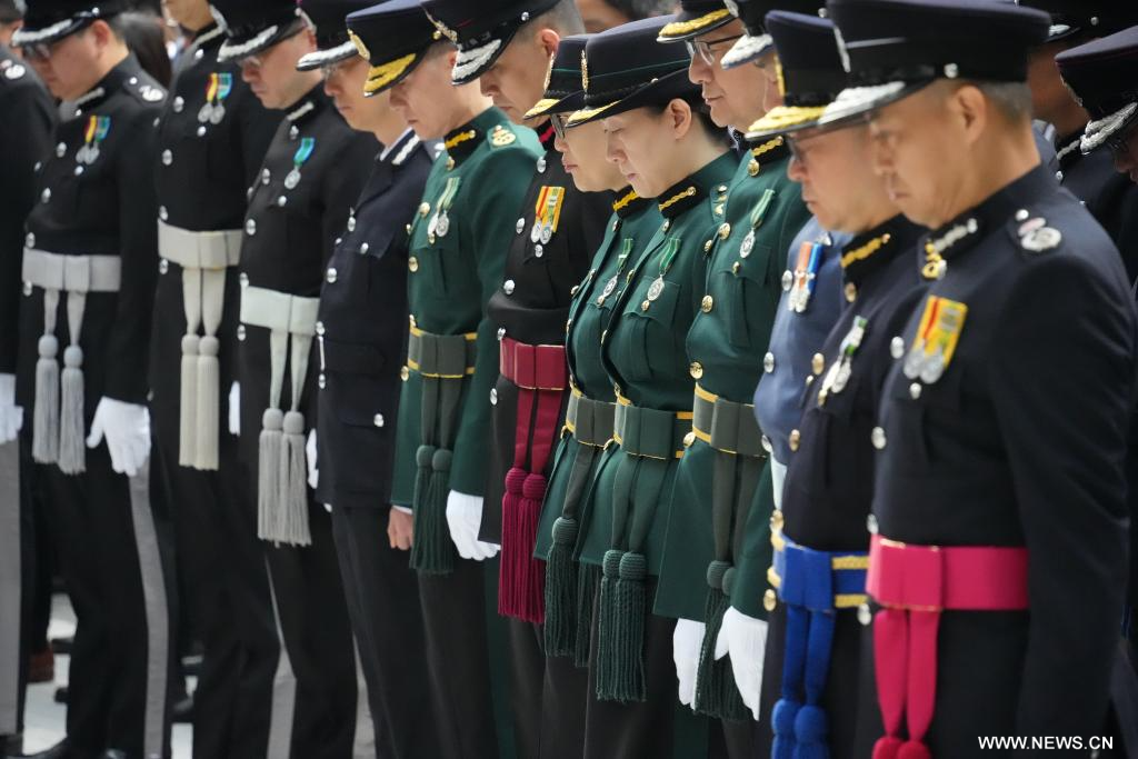 هونغ كونغ 29 نوفمبر 2025 (شينخوا) في الصورة الملتقطة يوم 29 نوفمبر 2025، جانب من مراسم تأبين عقدت من أجل ضحايا حريق مبنى سكني في منطقة هونغ كونغ بجنوبي الصين. وتم تنكيس العلم الوطني وعلم منطقة هونغ كونغ الإدارية الخاصة إلى نصف الصاري في جميع المباني الحكومية.