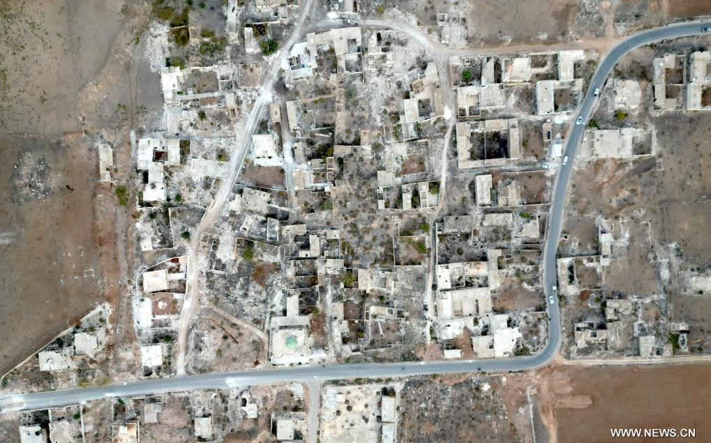 دمشق 8 ديسمبر 2025 (شينخوا) في الصورة الملتقطة من الجو بواسطة طائرة بدون طيار يوم 4 ديسمبر 2025، مشهد لمنازل متضررة في عين دقنة، في الريف الشمالي لمحافظة حلب، سوريا.