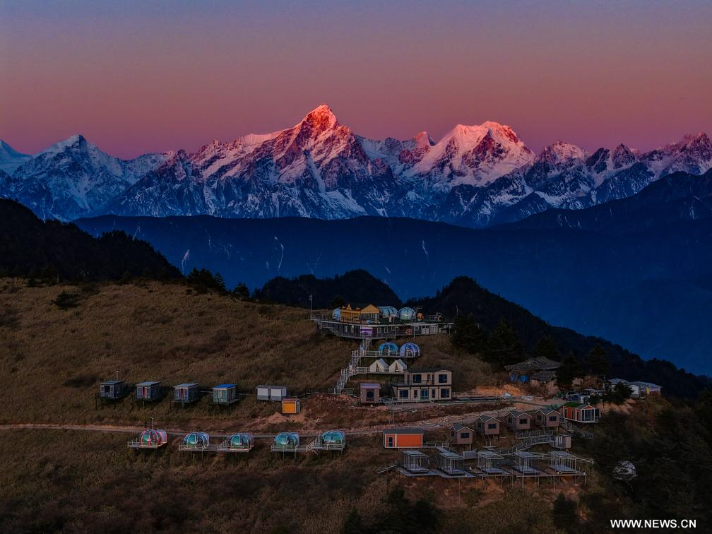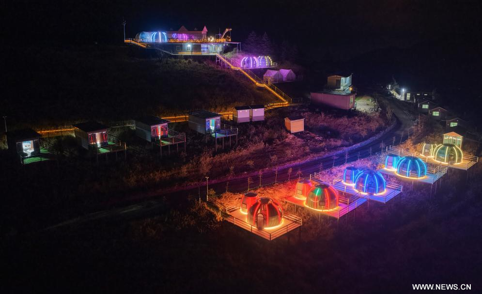 تشنغدو 19 ديسمبر 2025 (شينخوا) في الصورة الملتقطة يوم 18 ديسمبر 2025، جانب من فندق يتميز بغرف على شكل خيام شفافة توفر رؤية بانورامية للسماء والنجوم في قرية في ولاية قانتسي التبتية ذاتية الحكم في مقاطعة سيتشوان بجنوب غربي الصين. وجذبت هذه الخيام عددا كبيرا من الزوار مما عزز السياحة الريفية في الولاية.