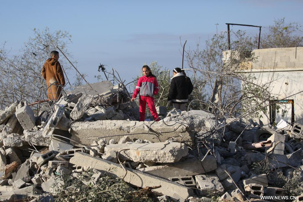 نابلس 25 ديسمبر 2025 (شينخوا) في الصورة الملتقطة يوم 24 ديسمبر 2025، فلسطينيون يتفقدون الأضرار بعد هدم منزل بجرافة إسرائيلية في بلدة بزاريا شمال غربي نابلس بالضفة الغربية.