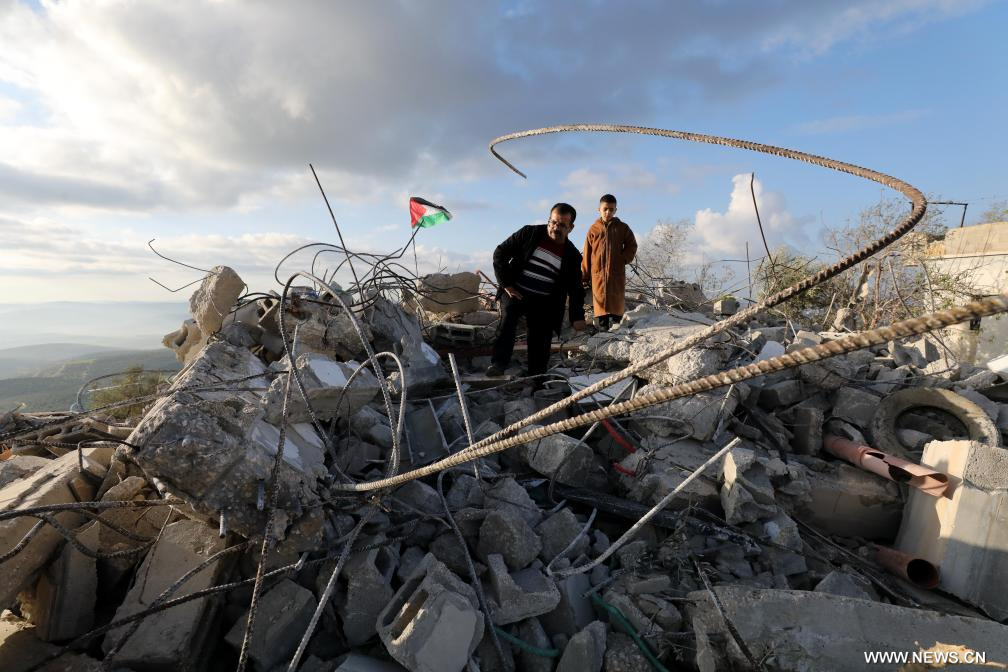 نابلس 25 ديسمبر 2025 (شينخوا) في الصورة الملتقطة يوم 24 ديسمبر 2025، فلسطينيان يتفقدان الأضرار بعد هدم منزل بجرافة إسرائيلية في بلدة بزاريا شمال غربي نابلس بالضفة الغربية.