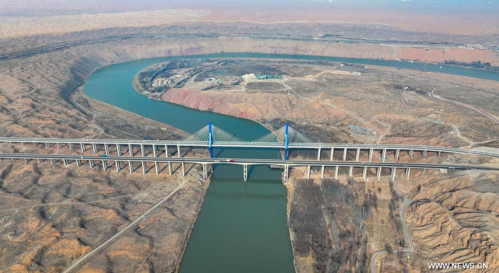 تشونغوي أول يناير 2026 (شينخوا) في الصورة الملتقطة يوم 30 ديسمبر 2025، مشهد جوي لجسر هيشانشيا الضخم الممتد على النهر الأصفر في مدينة تشونغوي بمنطقة نينغشيا الذاتية الحكم لقومية هوي في شمال غربي الصين، حيث تم تشغيل الجسر الضخم يوم الثلاثاء الماضي، بطول إجمالي يبلغ 1539 مترا.