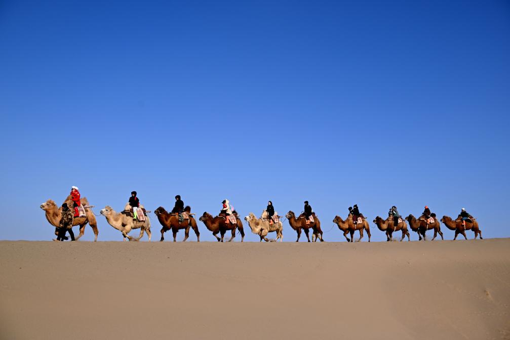 بكين 5 يناير 2026 (شينخوا) في الصورة الملتقطة يوم 2 يناير 2026، زوار يزورون منطقة جبل مينغشا ونبع الهلال المنظرية في دونهوانغ في مقاطعة قانسو بشمال غربي الصين. وشهدت الصين ما مجموعه 142 مليون رحلة داخلية خلال عطلة رأس السنة الجديدة التي استمرت ثلاثة أيام، بينما سجلت إجمالي إنفاق سياحي بلغ قرابة 12.1 مليار دولار أمريكي.