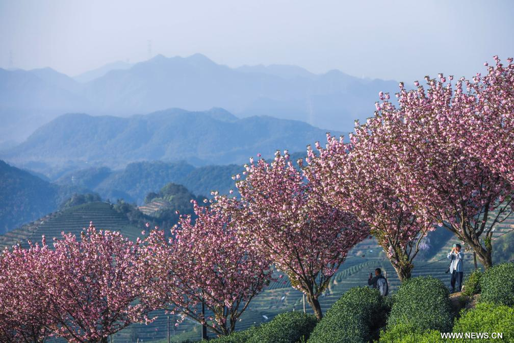 في الصورة الملتقطة يوم 6 أبريل 2025، جانب من مزرعة شاي في قرية باشان بحي فويانغ في مدينة هانغتشو بمقاطعة تشجيانغ في شرقي الصين، حيث تنتشر أشجار الكرز في مزارع الشاي الشاسعة، مما يجذب الكثير من السياح.