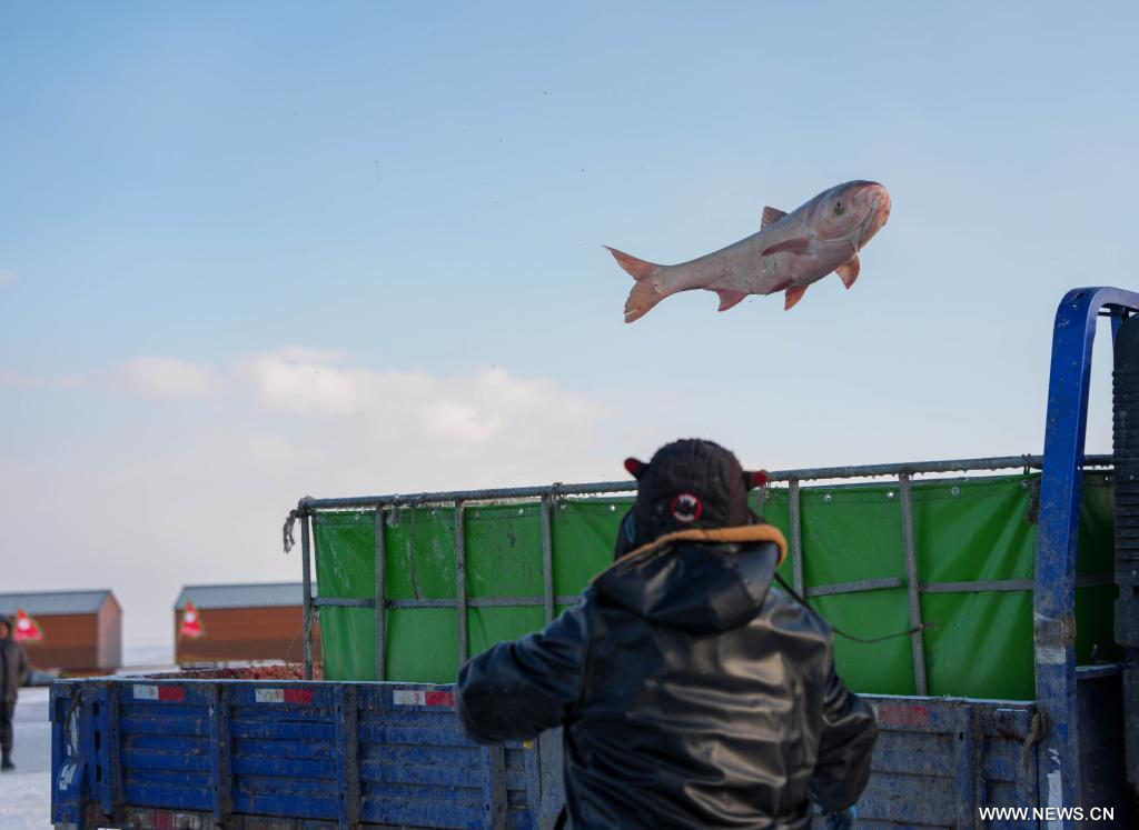 سونغيوان 9 يناير 2026 (شينخوا) في الصورة الملتقطة يوم 7 يناير 2026، صياد يرمي سمكة كبيرة في صندوق شاحنة على ضفة بحيرة تشاقان بمدينة سونغيوان في مقاطعة جيلين بشمال شرقي الصين.