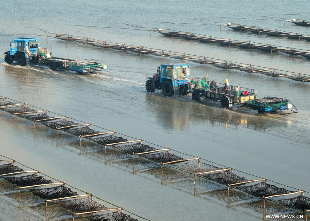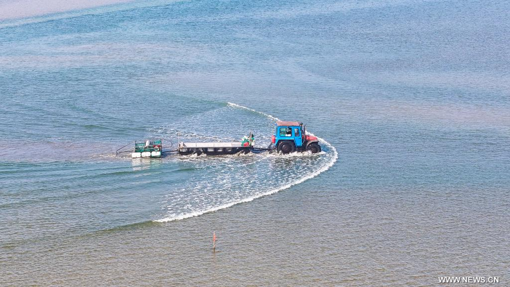 حصاد الطحالب البحرية في منطقة تربية الطحالب البحرية في البحر الأصفر