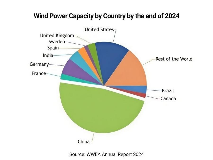 فقد لعبت الصين دورا استثنائيا في دفع عجلة طاقة الرياح العالمية، حيث أضافت سعة جديدة بقدرة 79.8 مليون كيلوواط في عام 2024 بزيادة من 75.9 مليون كيلوواط في عام 2023. وتمثل الصين 72 بالمائة من السوق العالمية لتوربينات الرياح الجديدة، بزيادة مطردة من 65 بالمائة في عام 2023 و58 بالمائة في عام 2022، وفقا لتقرير صادر عن جمعية طاقة الرياح العالمية.