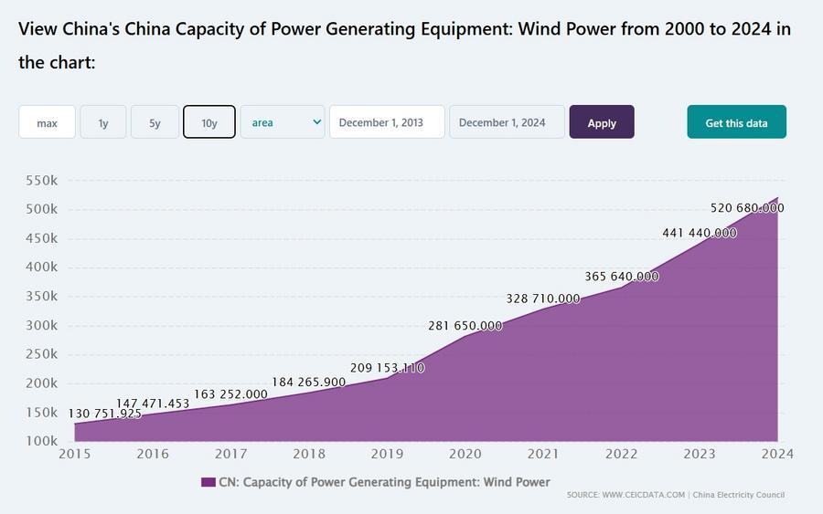 عرض سعة معدات توليد الطاقة في الصين: طاقة الرياح من عام 2000 حتى عام 2024 في هذا الرسم البياني