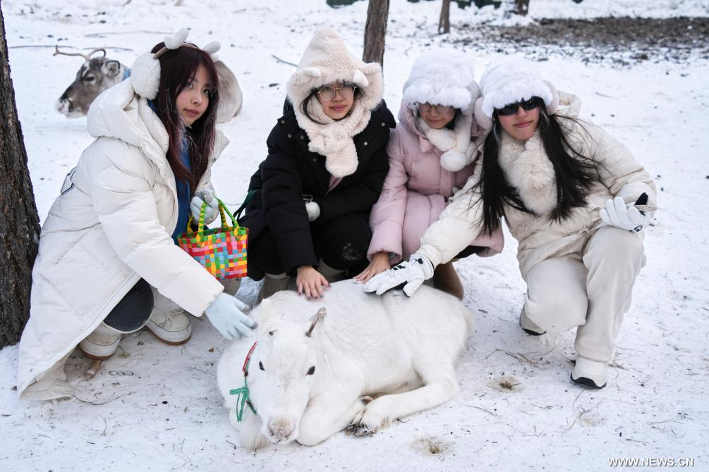 موخه 29 يناير 2026 (شينخوا) في الصورة الملتقطة يوم 28 يناير 2026، زائرات يأخذن صورا مع أحد غزلان الرنة في قرية بيجي بمدينة موخه في مقاطعة هيلونغجيانغ شمال شرقي الصين.