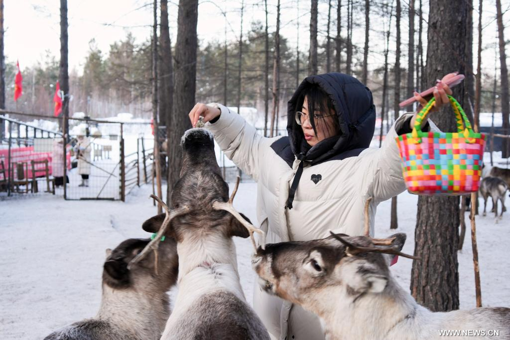 موخه 29 يناير 2026 (شينخوا) في الصورة الملتقطة يوم 28 يناير 2026، زائرة تقدم طعاما لغزلان الرنة في قرية بيجي بمدينة موخه في مقاطعة هيلونغجيانغ شمال شرقي الصين.