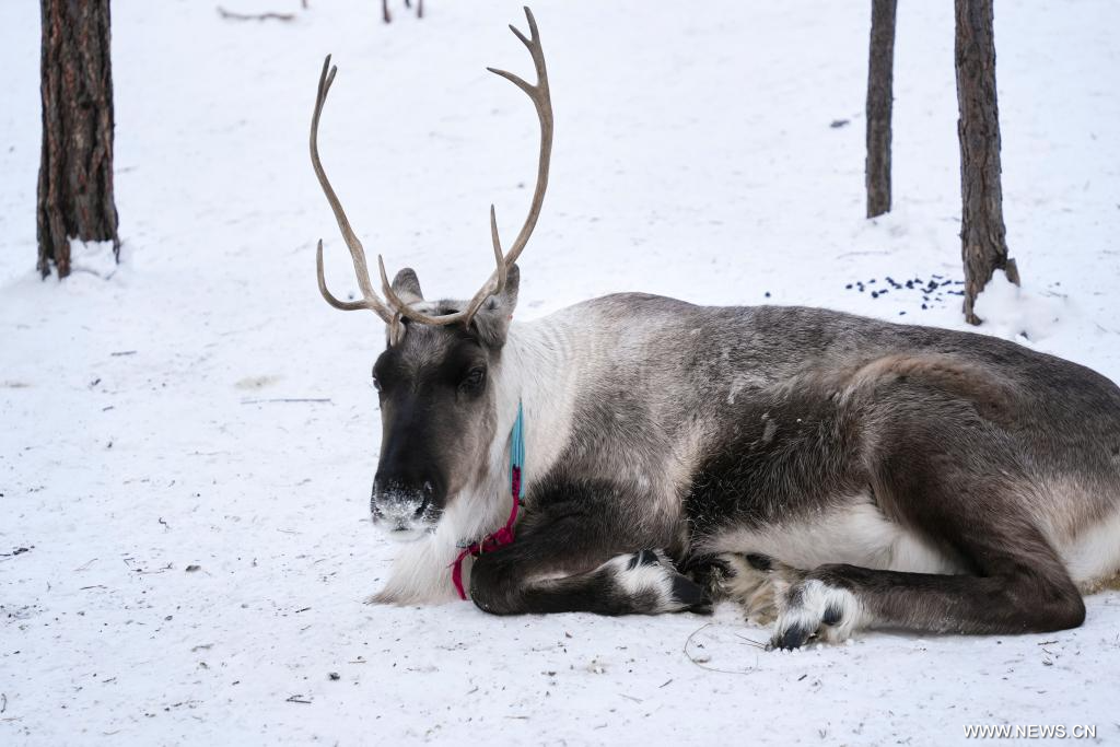 موخه 29 يناير 2026 (شينخوا) في الصورة الملتقطة يوم 28 يناير 2026، أحد غزلان الرنة يستريح في قرية بيجي بمدينة موخه في مقاطعة هيلونغجيانغ شمال شرقي الصين.