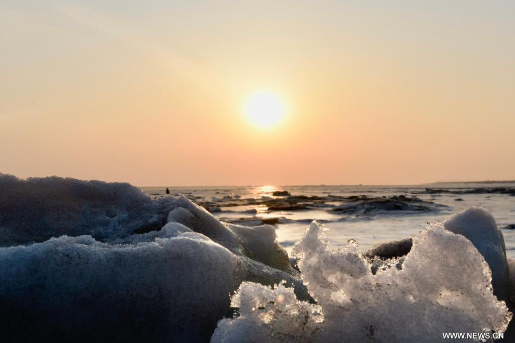منظر غروب الشمس قبالة البحر المتجمد في شمال شرقي الصين