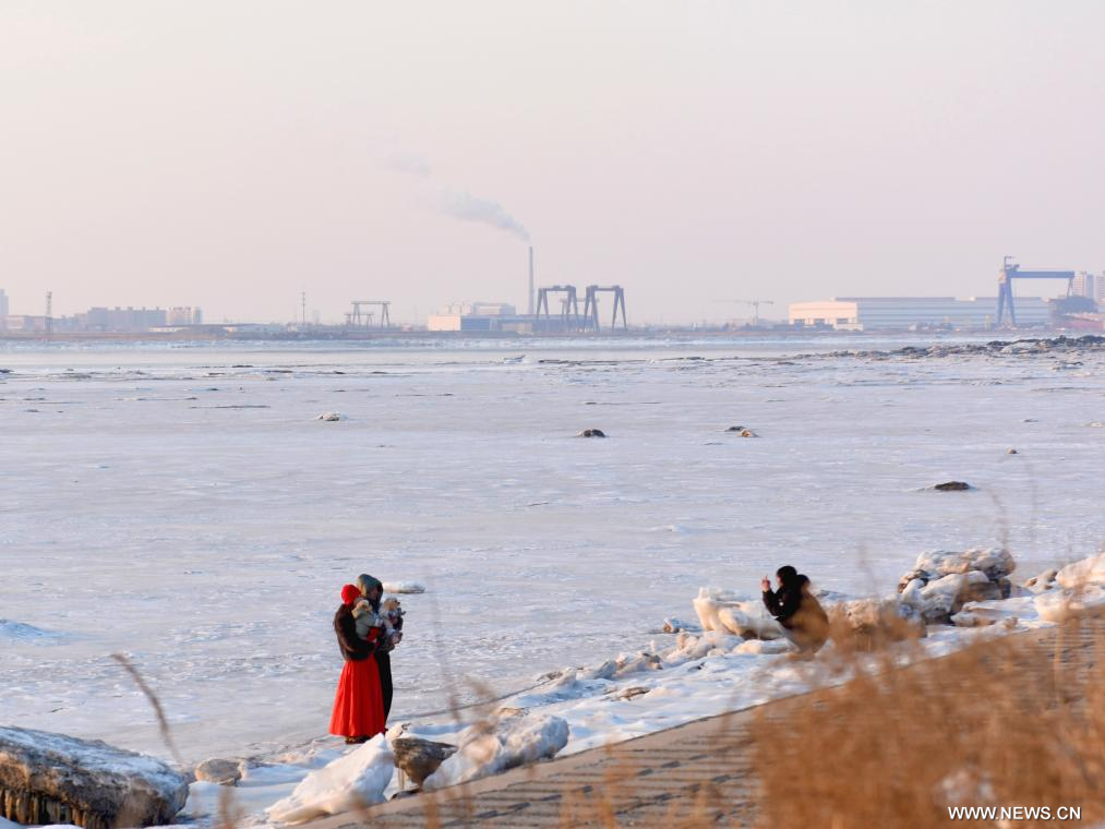 يينغكو 7 فبراير 2026 (شينخوا) في الصورة الملتقطة يوم 6 فبراير 2026، زوار يلتقطون صورا وقت غروب الشمس قبالة حديقة شيباوتاي، حيث تجمدت مياه خليج بحر بوهاي مشكلة منظر "البحر المتجمد" في مدينة يينغكو بمقاطعة لياونينغ في شمال شرقي الصين.