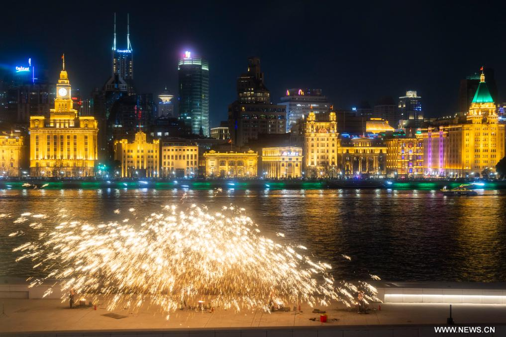 شانغهاي 9 فبراير 2026 (شينخوا) في الصورة الملتقطة يوم 8 فبراير 2026، مشهد لعرض للألعاب النارية بالحديد المنصهر بجانب نهر هوانغبو في بودونغ ببلدية شانغهاي شرقي الصين.