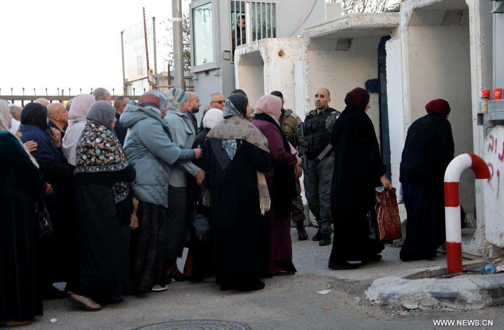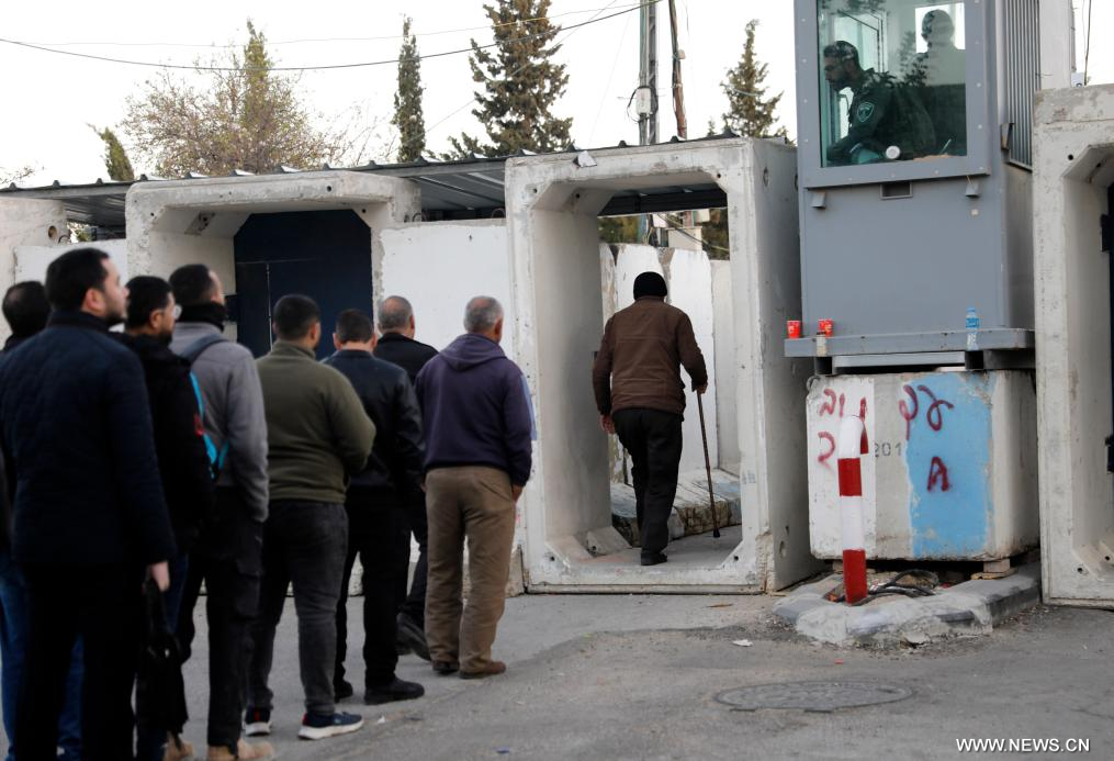 بيت لحم 20 فبراير 2026 (شينخوا) في الصورة الملتقطة يوم 20 فبراير 2026، فلسطينيون ينتظرون عبور حاجز تفتيش إسرائيلي أثناء توجههم لأداء أول صلاة جمعة في رمضان في المسجد الأقصى بالقدس، في مدينة بيت لحم بالضفة الغربية.