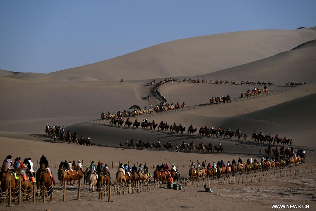 بكين 20 فبراير 2026 (شينخوا) في الصورة الملتقطة يوم 19 فبراير 2026، سياح يزورون منطقة جبل مينغشا ونبع الهلال السياحية في مدينة دونهوانغ بمقاطعة قانسو شمال غربي الصين.