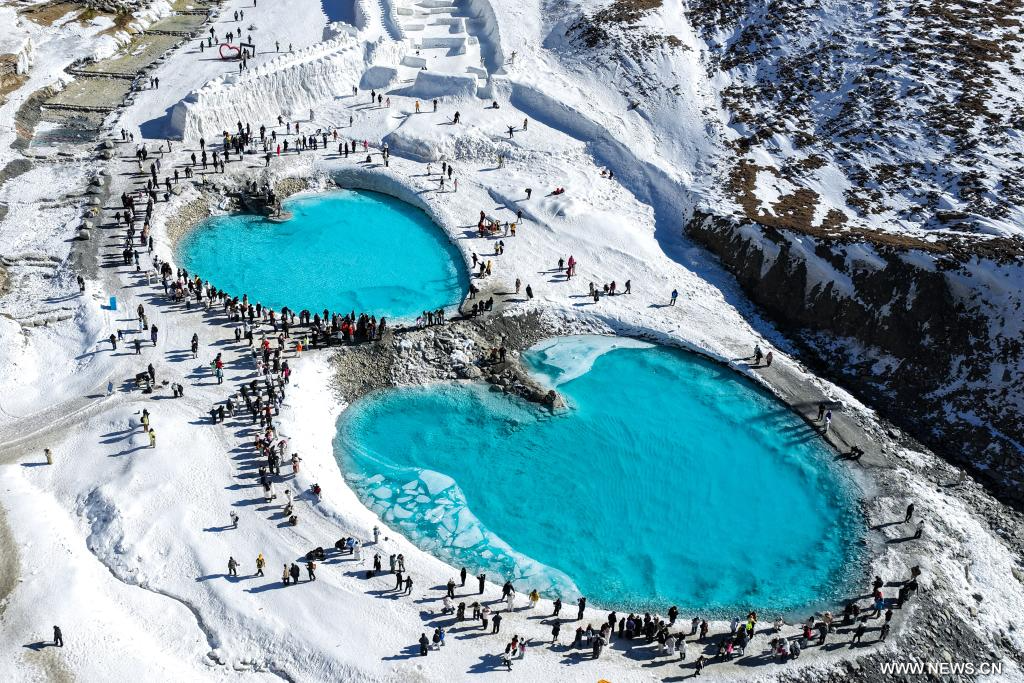 بكين 20 فبراير 2026 (شينخوا) في الصورة الجوية الملتقطة بطائرة بدون طيار يوم 20 فبراير 2026، سياح يستمتعون بوجودهم على جبل ثلجي في محافظة منيوان ذاتية الحكم لقومية هوي في ولاية هايبي التبتية ذاتية الحكم، بمقاطعة تشينغهاي شمال غربي الصين.