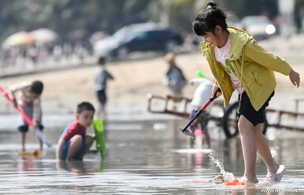 فانغتشنغقانغ 21 فبراير 2026 (شينخوا) في الصورة الملتقطة يوم 20 فبراير 2026، أطفال يلعبون على الشاطئ خلال عطلة عيد الربيع في فانغتشنغقانغ بمنطقة قوانغشي ذاتية الحكم لقومية تشوانغ بجنوبي الصين.
