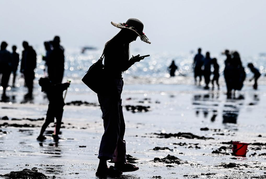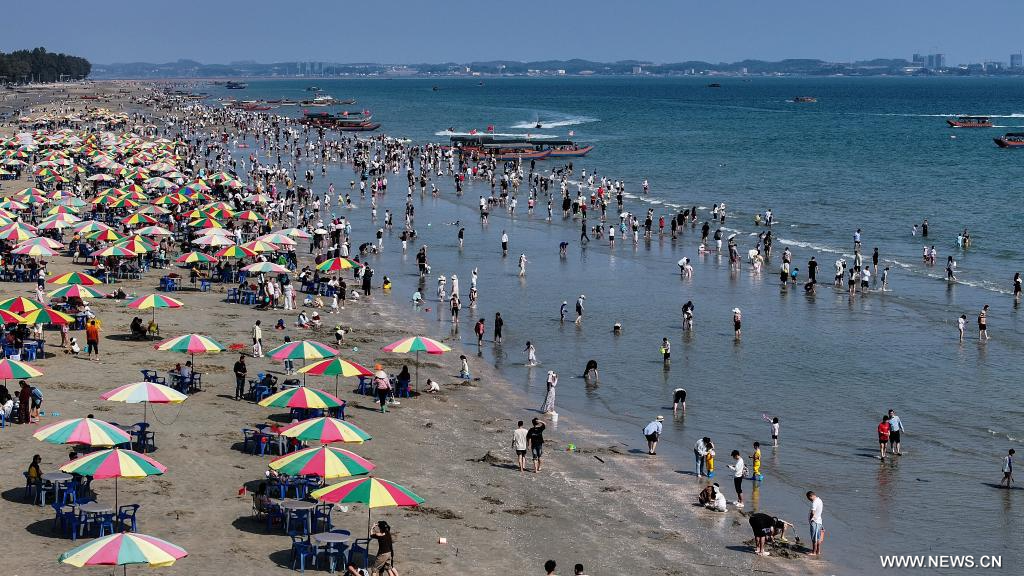 فانغتشنغقانغ 21 فبراير 2026 (شينخوا) في الصورة الملتقطة يوم 20 فبراير 2026، أناس يستمتعون بأوقات فراغهم على الشاطئ خلال عطلة عيد الربيع في فانغتشنغقانغ بمنطقة قوانغشي ذاتية الحكم لقومية تشوانغ بجنوبي الصين.