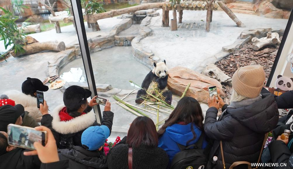 بكين 21 فبراير 2026 (شينخوا) في الصورة الملتقطة يوم 20 فبراير 2026، سياح يلتقطون صورا لباندا عملاقة في حديقة حيوان بمدينة أورومتشي، حاضرة منطقة شينجيانغ الويغورية ذاتية الحكم شمال غربي الصين، وذلك خلال عطلة عيد الربيع التي تمتد تسعة أيام هذا العام.