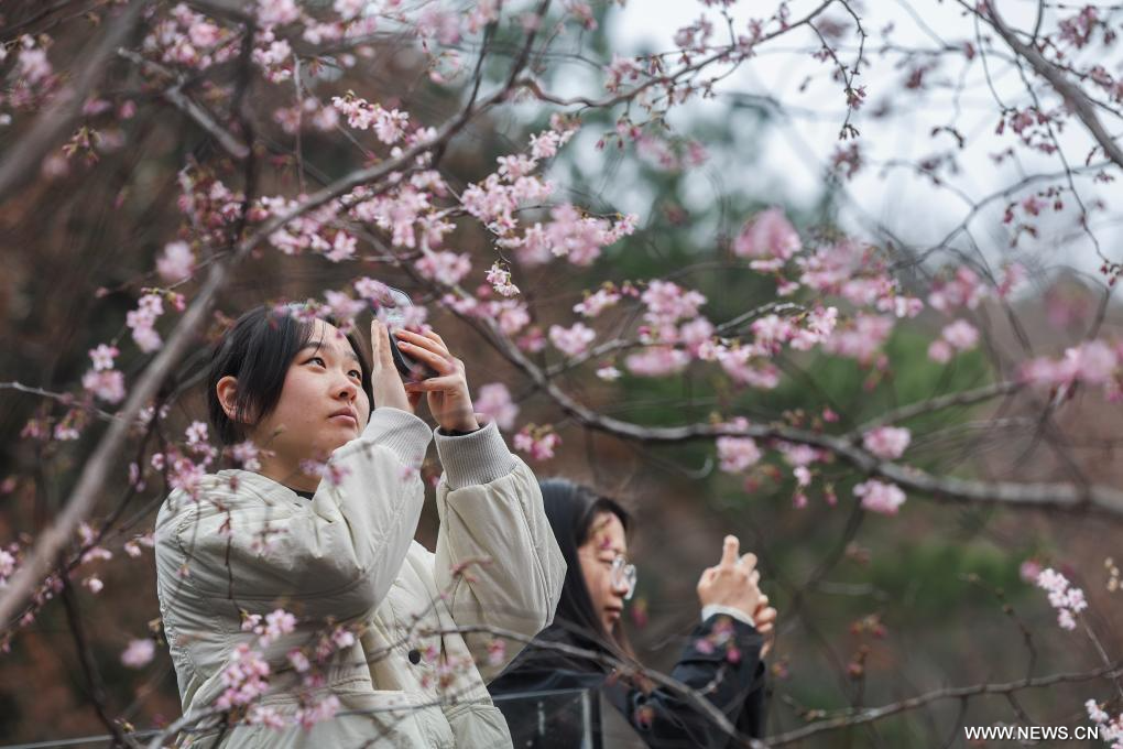 جيانده 26 فبراير 2026 (شينخوا) في الصورة الملتقطة يوم 25 فبراير 2026، سائحتان تلتقطان صورا لأزهار الكرز البرية في بلدة ساندو بمدينة جيانده في مقاطعة تشجيانغ بشرقي الصين.