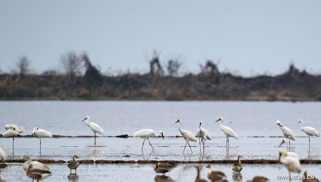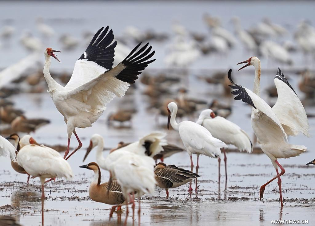 يويقان أول مارس 2026 (شينخوا) في الصورة الملتقطة يوم 27 فبراير 2026، طيور الكركي الأبيض وأنواع أخرى من الطيور المهاجرة في محمية للأراضي الرطبة في محافظة يويقان بمدينة شانغراو في مقاطعة جيانغشي بشرقي الصين.
