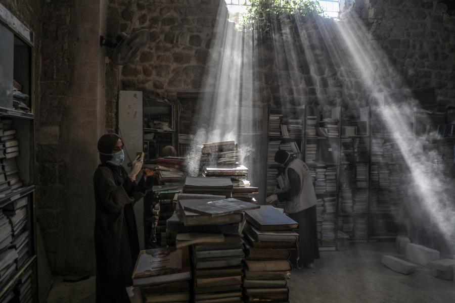 غزة 9 مارس 2026 (شينخوا) فيما يتحرك عدد من المتطوعين بخطى خفيفة بين الركام وبقايا الكتب، يتسلل شعاع من ضوء الشمس عبر فجوة في سقف القاعة التي كانت تضم مكتبة المسجد العمري الكبير في البلدة القديمة بمدينة غزة، ليسقط على أكوام من الكتب المبعثرة والممزقة والمحترقة.