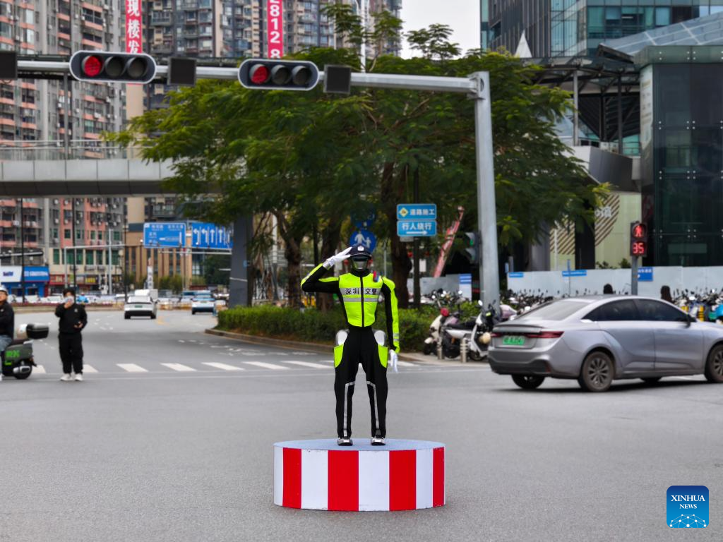 شنتشن 15 مارس 2026 (شينخوا) ظهرت في مركز التكنولوجيا بمدينة شنتشن في مقاطعة قوانغدونغ بجنوبي الصين شخصية جديدة ذات طابع مستقبلي تتولى توجيه حركة المرور في أحد التقاطعات في شوارع المدينة.