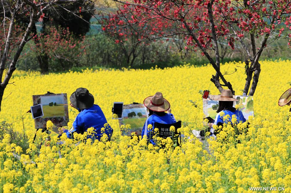 بكين 4 أبريل 2026 (شينخوا) في الصورة الملتقطة يوم 3 أبريل 2026، طلاب يرسمون في حقل زهور الكول في بلدة تشانبي بمدينة شيويتشانغ في مقاطعة خنان بوسط الصين.
